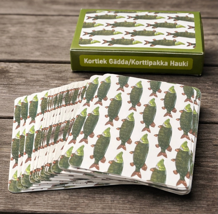 Korttipakka on vakiokorttipakka, jossa jokaisen kortin taustapuolella on hauki-aiheinen kuvio. Se sopii tavallisiin korttipeleihin ja pasianssiin. Se on helppo ottaa mukaan ja käyttää lyhyessä pelihetkessä, kotona tai matkalla.
