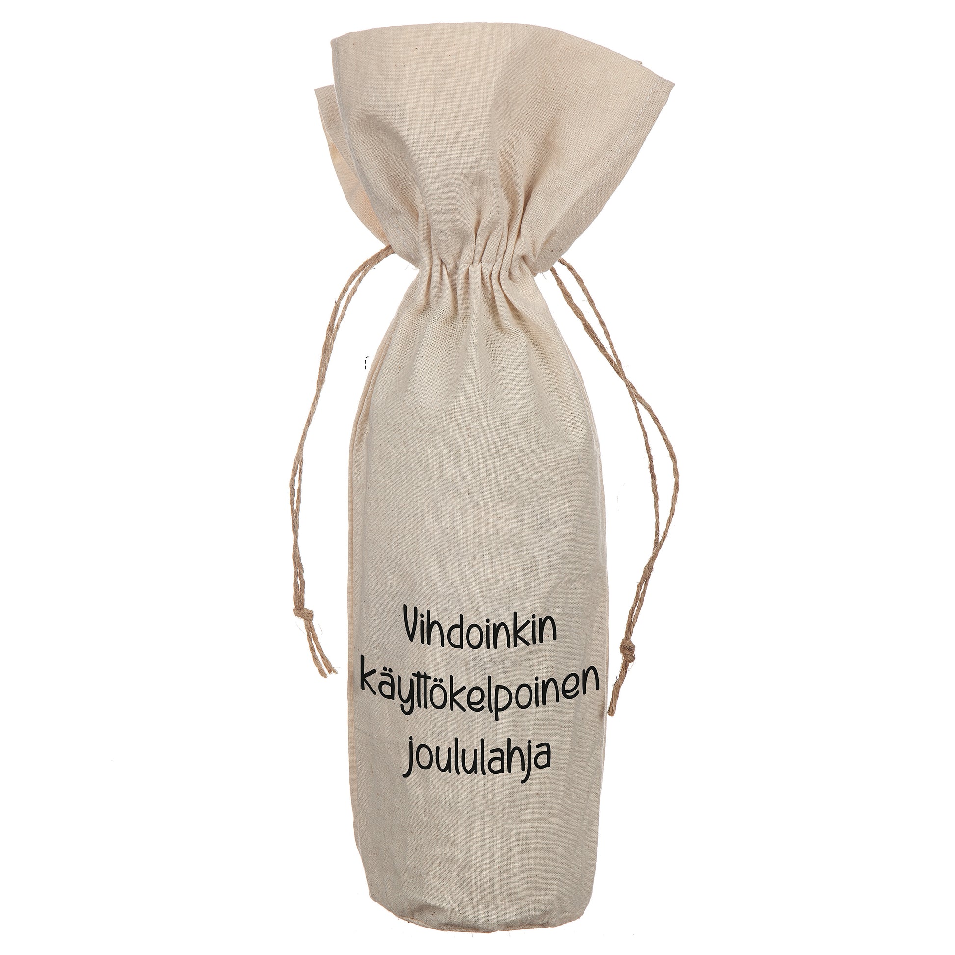Kangaskassi pullolle hauskalla tekstillä: "Vihdoinkin käyttökelpoinen joululahja".