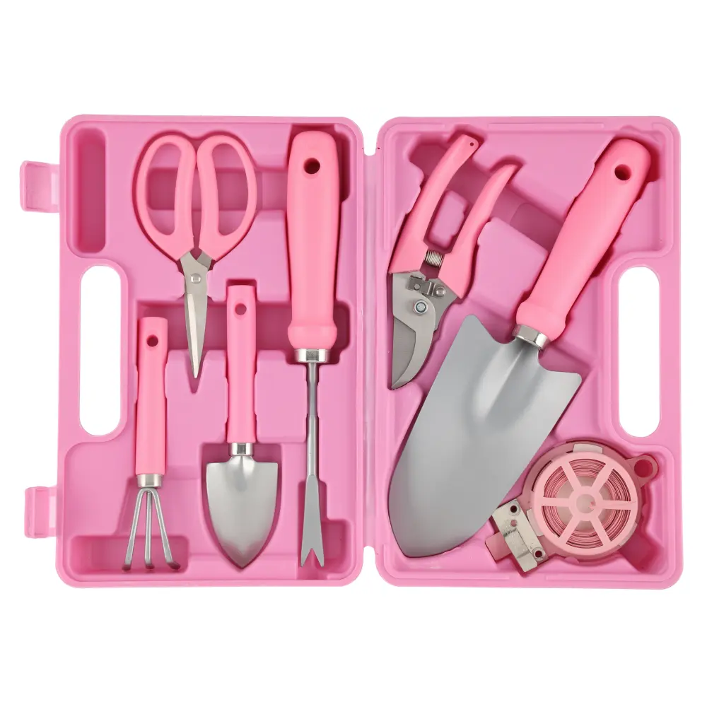 Kaiva, leikkaa ja hoida puutarhaa tyylillä! Tämä tyylikäs vaaleanpunainen työkalupakki on täynnä käytännöllisiä puutarhatyökaluja – täydellinen sekä aloittelijalle että kokeneelle puutarhan ystävälle, joka arvostaa sekä toimivuutta että väriä.