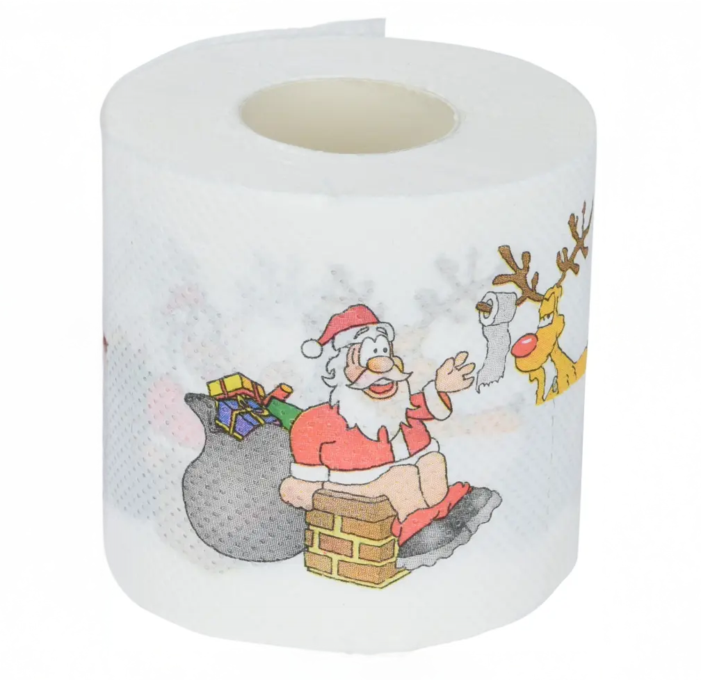 Jouluisella kuosilla varustettu wc-paperi – pieni yksityiskohta, joka tuo kylpyhuoneeseen lisää joulutunnelmaa.